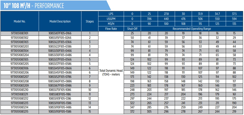 Các model bơm Franklin 10 inch loại lưu lượng 108m3/h