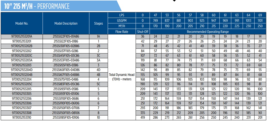 Các model bơm Franklin 10 inch loại lưu lượng 215m3/h